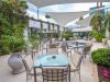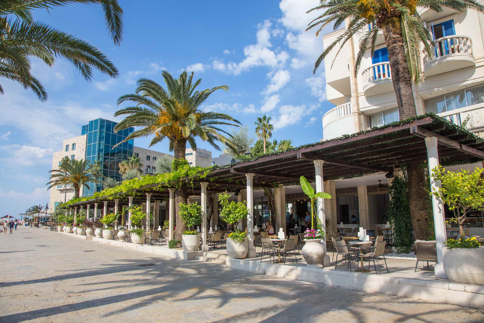 The terrace next to the pool, facing the sea, is surrounded by palm trees and other greenery and gives the feeling of a Mediterranean ambience. It can accommodate 200 guests and is designed for medium-sized weddings.